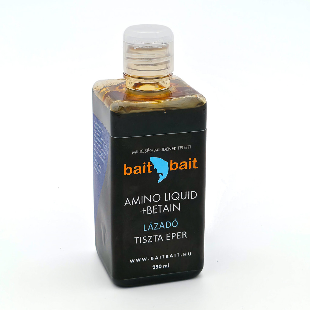 A Bait Bait Liquid Aminója egy különleges összetételű étvágyfokozó folyadék. Magas természetes cukortartalommal, ezenfelül egy speciális aminosav keverék teszi egyedibbé. Kúszó képességének köszönhetően a bojlikat lelocsolva mélyen a belsejébe szívódik. Speciális anyag összetevőjének köszönhetően a bojli felszínét elkezdi feloldani, így elérve gyorsabb hatást. Extra Betain tartalom jellemzi ezt a sűrű PVA barát folyadékot.